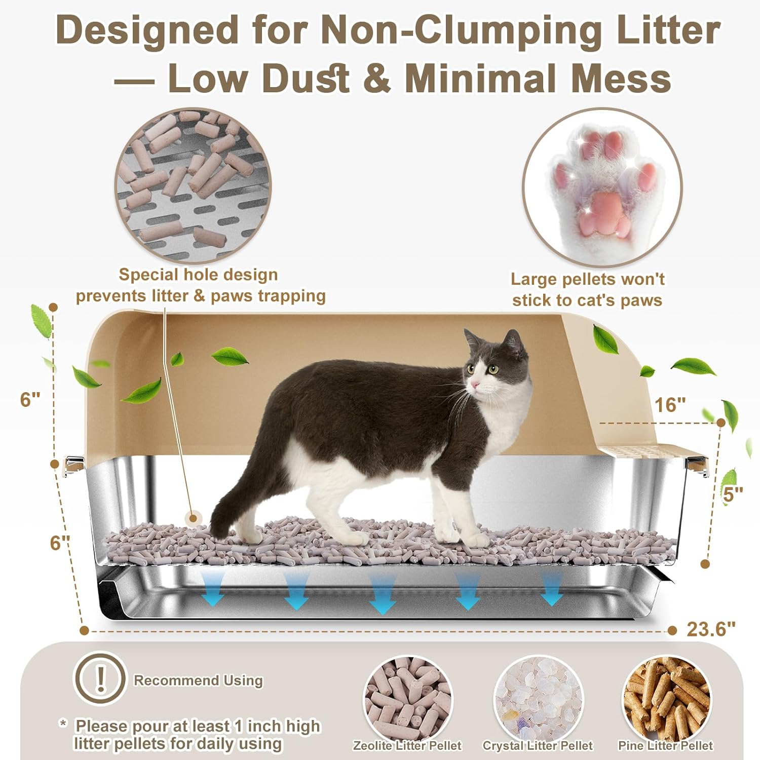 Easy Maintenance: This cat litter box metal with lid is designed to work exclusively with non-clumping, water-insoluble litter (crystal, pine pellets, or zeolite) for optimal drainage efficiency. Liquid waste percolates rapidly to base tray, minimizing waste and simplifying cleanup. The larger pellet size minimizes litter tracking, as it doesn’t cling to your cat's paws as much. Just scoop solids daily for hassle-free maintenance. The naturally absorbent material is reusable: rinse and air-dry between uses. An eco-friendly solution that enhances convenient cat care