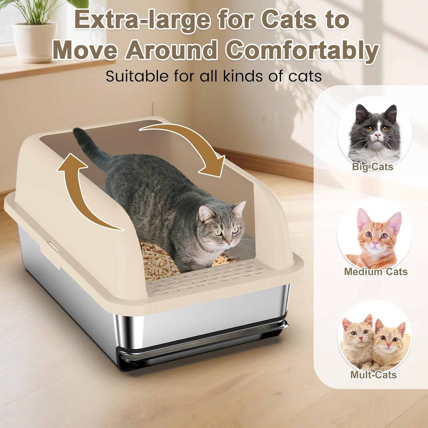 Extra Large Designed for Your Beloved Cats: This extra large sifting cat litter box measures 23.6" long by 16" wide, with an extra large capacity of 37 L to hold litter. Even during your travels,there's no need to stress about running out of litter and disrupting your cat's routine. With a spacious 16" width, this litter box gives Maine Coons, Ragdolls, and other large breeds ample room to turn and move around comfortably, reducing the cramped feeling of traditional boxes
