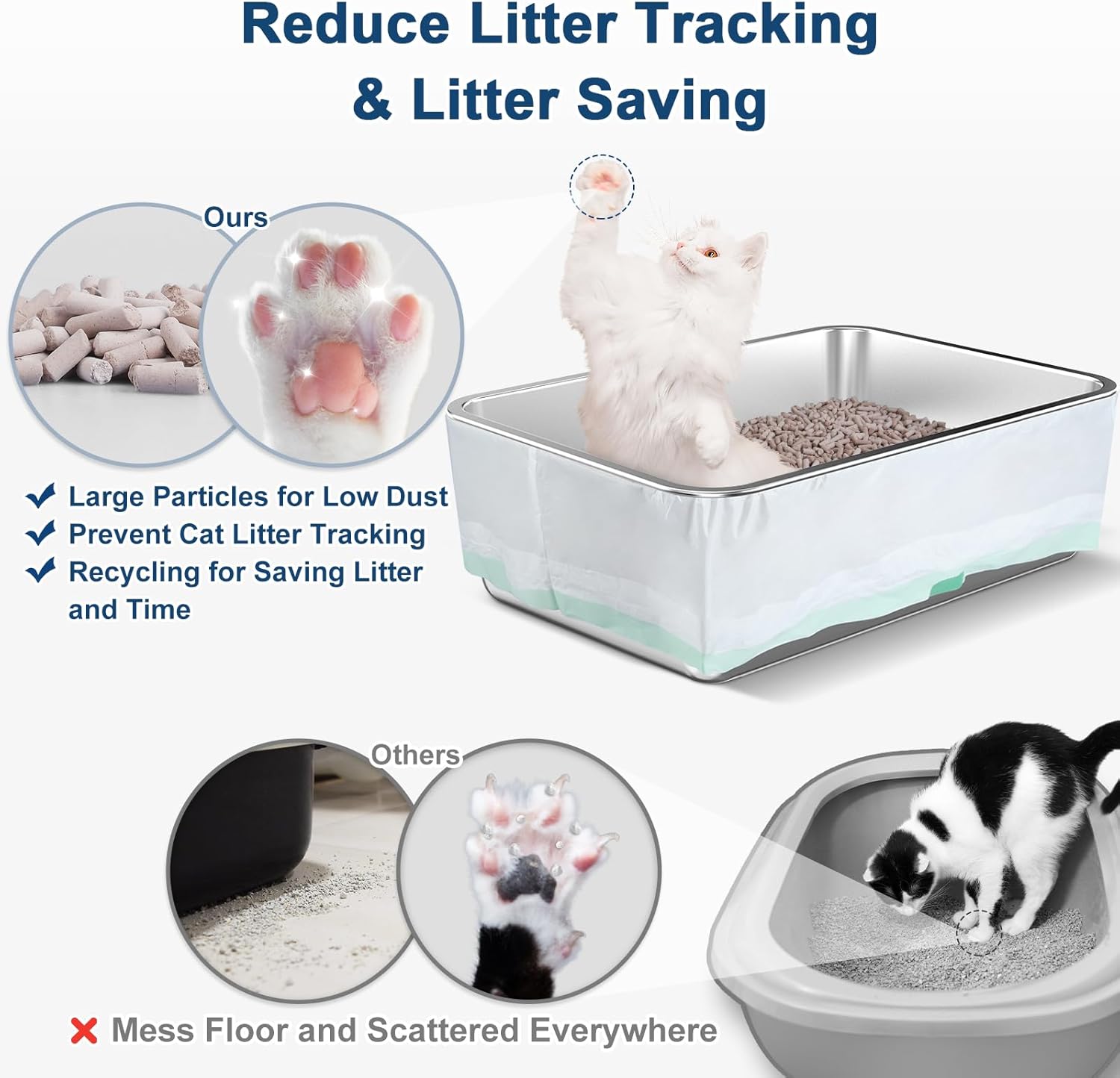 Designed for Non-Clumping Pellets: This cat litter box stainless steel contains a sifting litter pan for non-clumping pellet such as zeolite litter pellets, pine pellets, or crystal litter pellets. The diameter of the elliptical sieve holes that laser on is approximately 1.5 inches, which prevents litter from falling to the bottom and effectively filters urine, which is absorbed through the urine pad on the bottom pan, creating a clean and hygienic environment for your cats